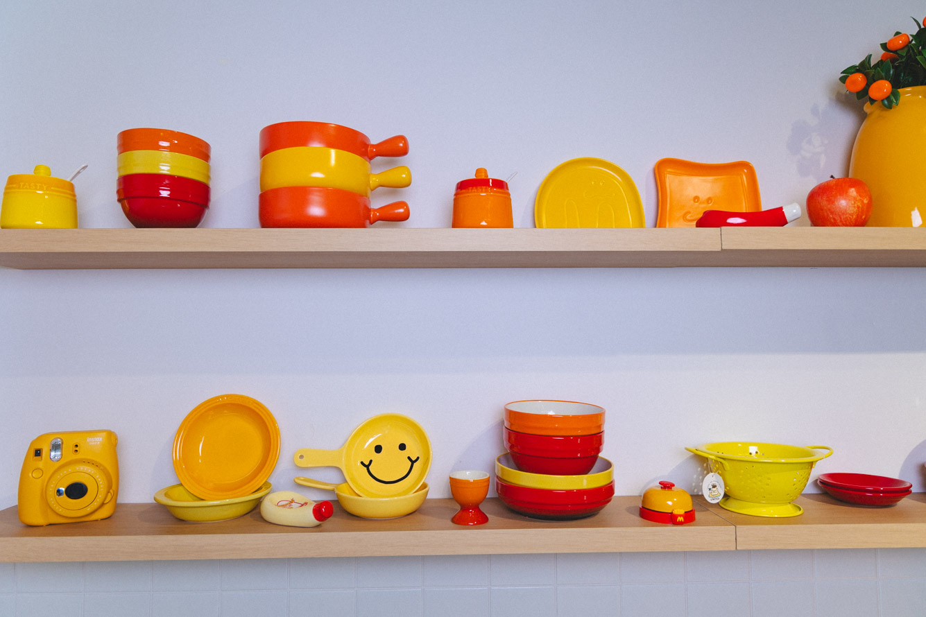 선반에 진열된 접시와 컵, 수납장 안의 식기류, 냄비·프라이팬·도마·칼 등